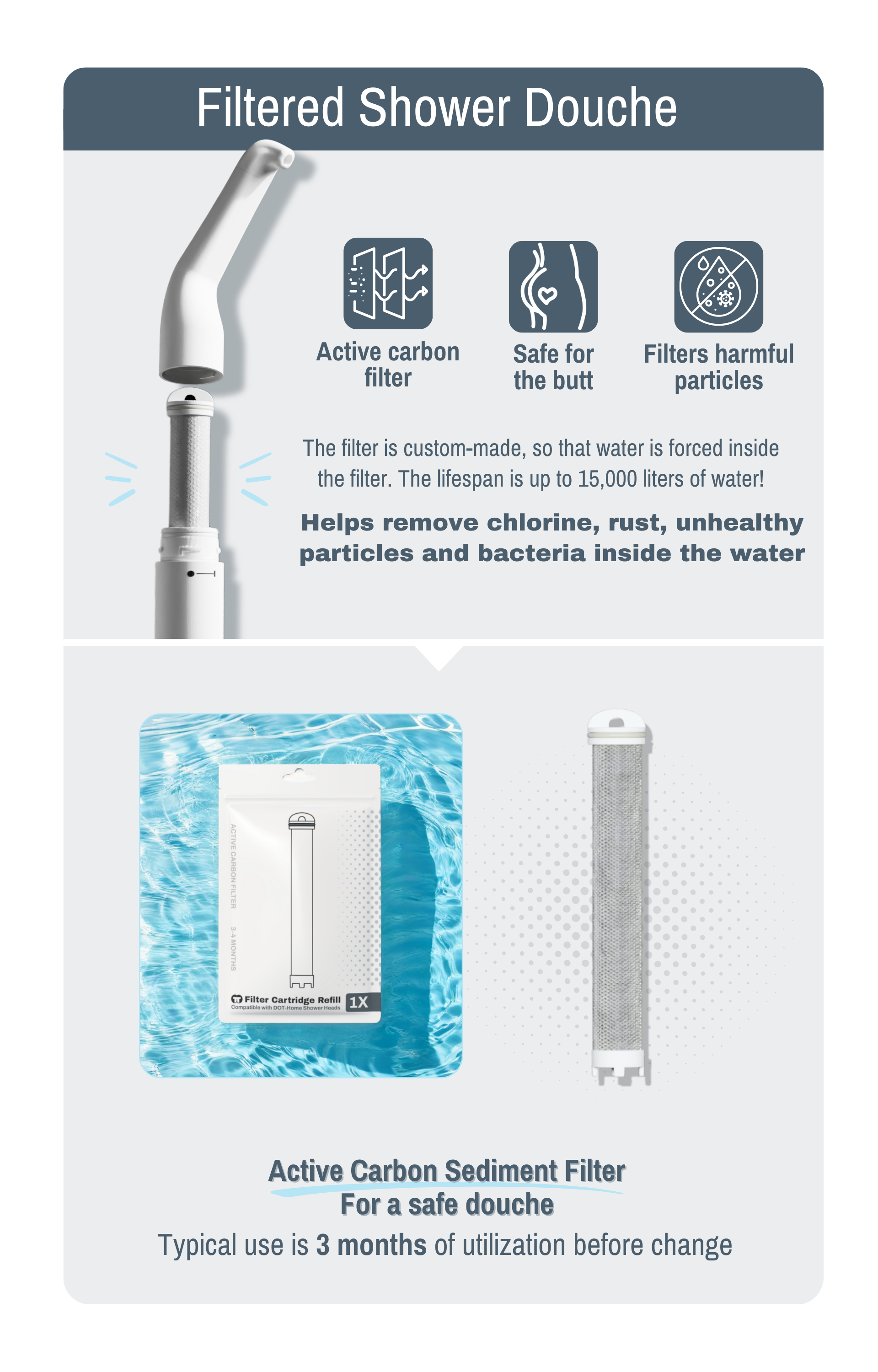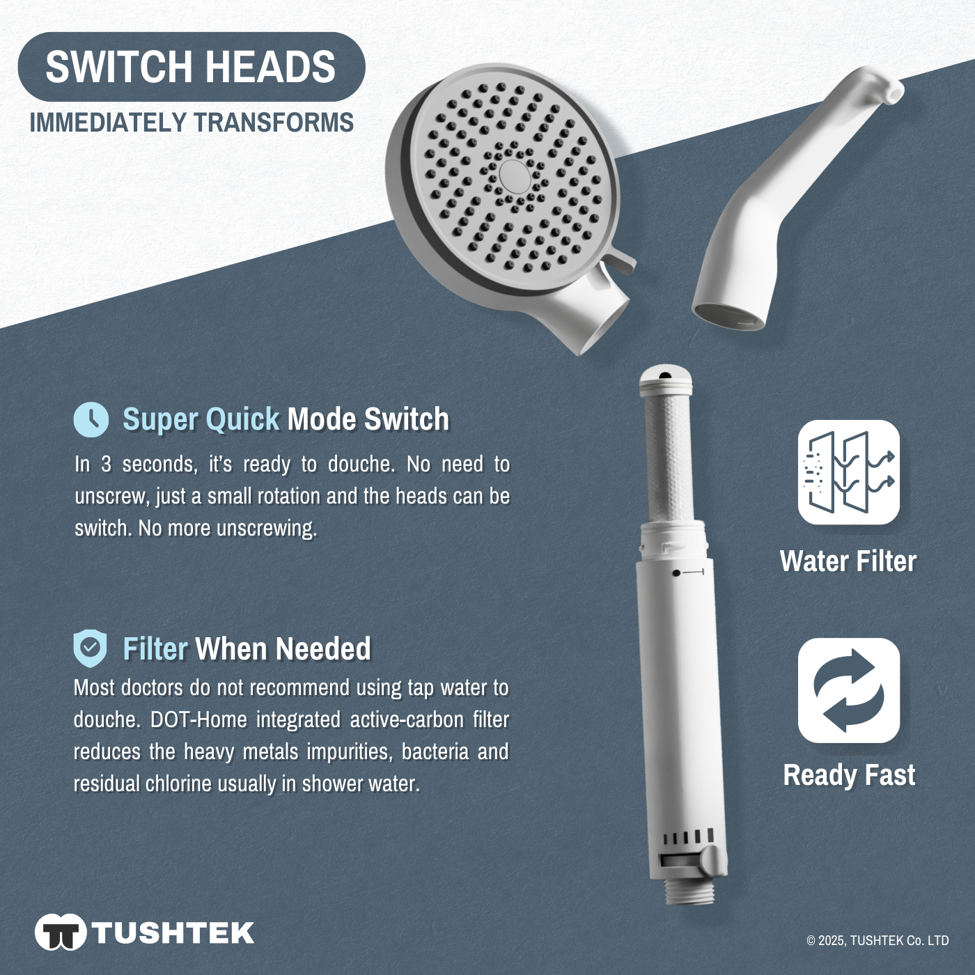 ❓ Q1: How does this showerhead differ from a normal one? ✅ A: The TUSHTEK is a 2-in-1 showerhead that includes an anal cleaning nozzle, with an activated carbon filter to ensure cleaner and safer water.